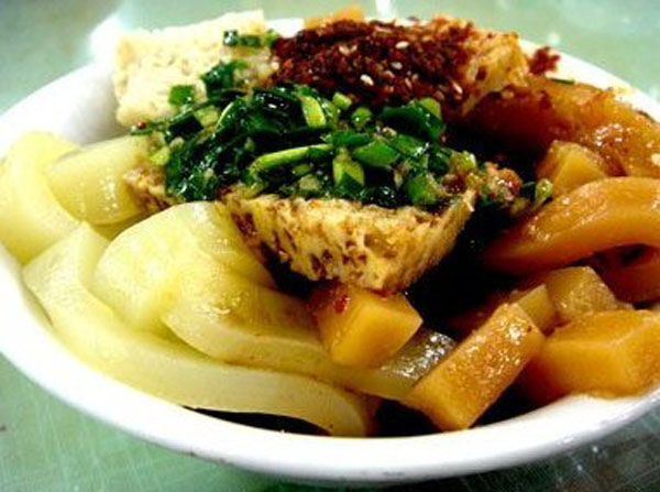 【古浪酿皮子】是用优质面粉精制而成的食品,色泽晶莹黄亮,透明如玉。制作时,选用优质面粉加水并加入少许蓬灰(一种绿色食用碱)水和成面团,然后在清水中多次揉搓,洗得淀粉和面筋分离。游离水中的淀粉,待其沉淀于容器底部,清去上面的黄水,再加入纯净水及适量的蓬灰水,调和成稀糊状,随即舀入大平底盘中,上笼入锅蒸熟;面筋亦上笼蒸,一蒸便煊起如海绵状。吃时切成筷子粗细长条或麻将块状,根据需要再加上酱油、醋汁、蒜泥、辣椒油、芥末、精盐及胡萝卜丝等调味品随碗搭配食用。这种凉爽的面食品,柔韧可口,酸辣凉爽极受人们喜爱,食者非常普遍 还有一种涮酿皮。制作方法与普通酿皮有所差异,一是蒸制时一般不加食用碱,二是不提取面筋,三是将调成稀糊状面粉直接舀入平底盘入锅蒸熟即成,其食品色泽白净,柔劲较强。